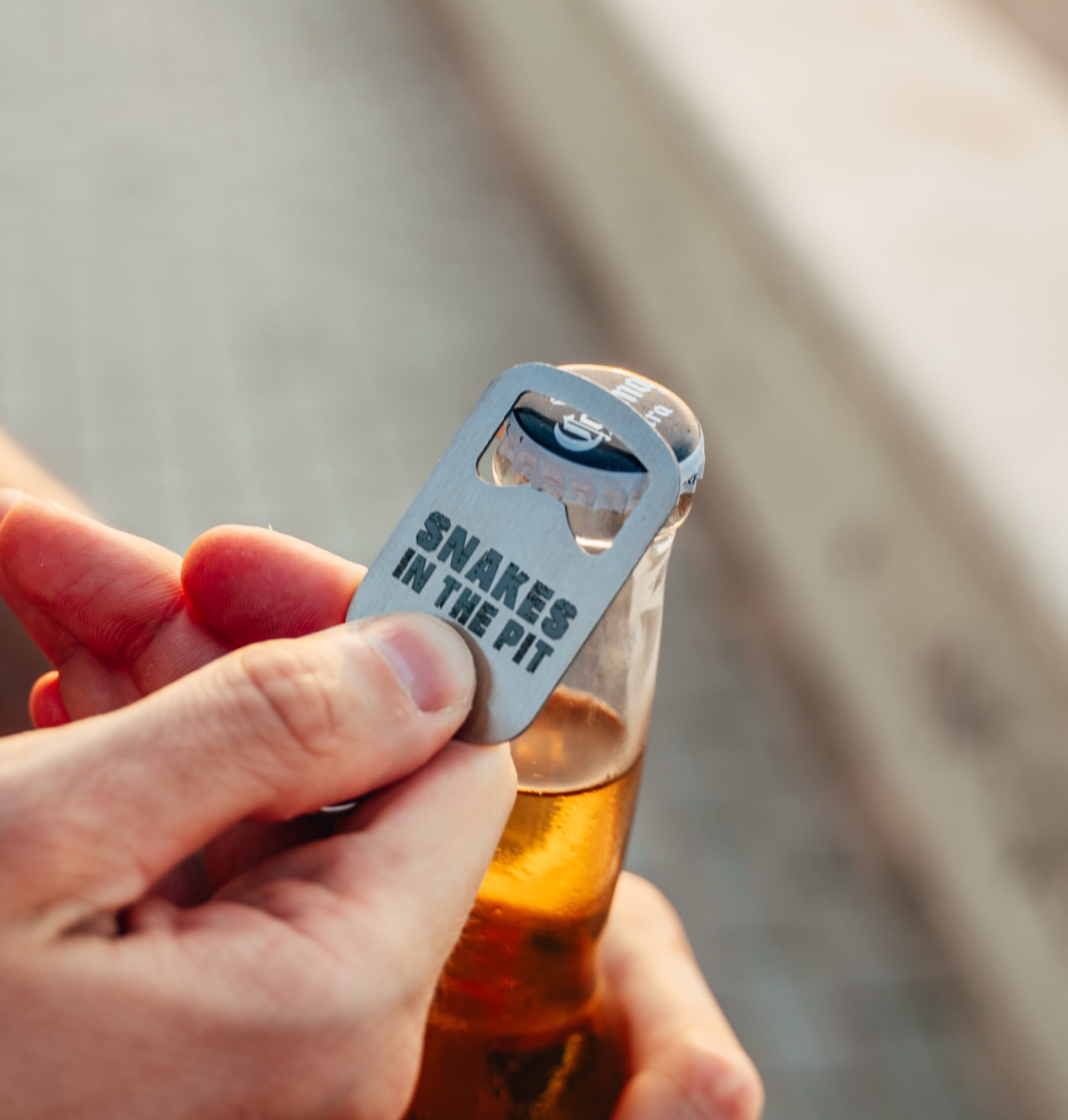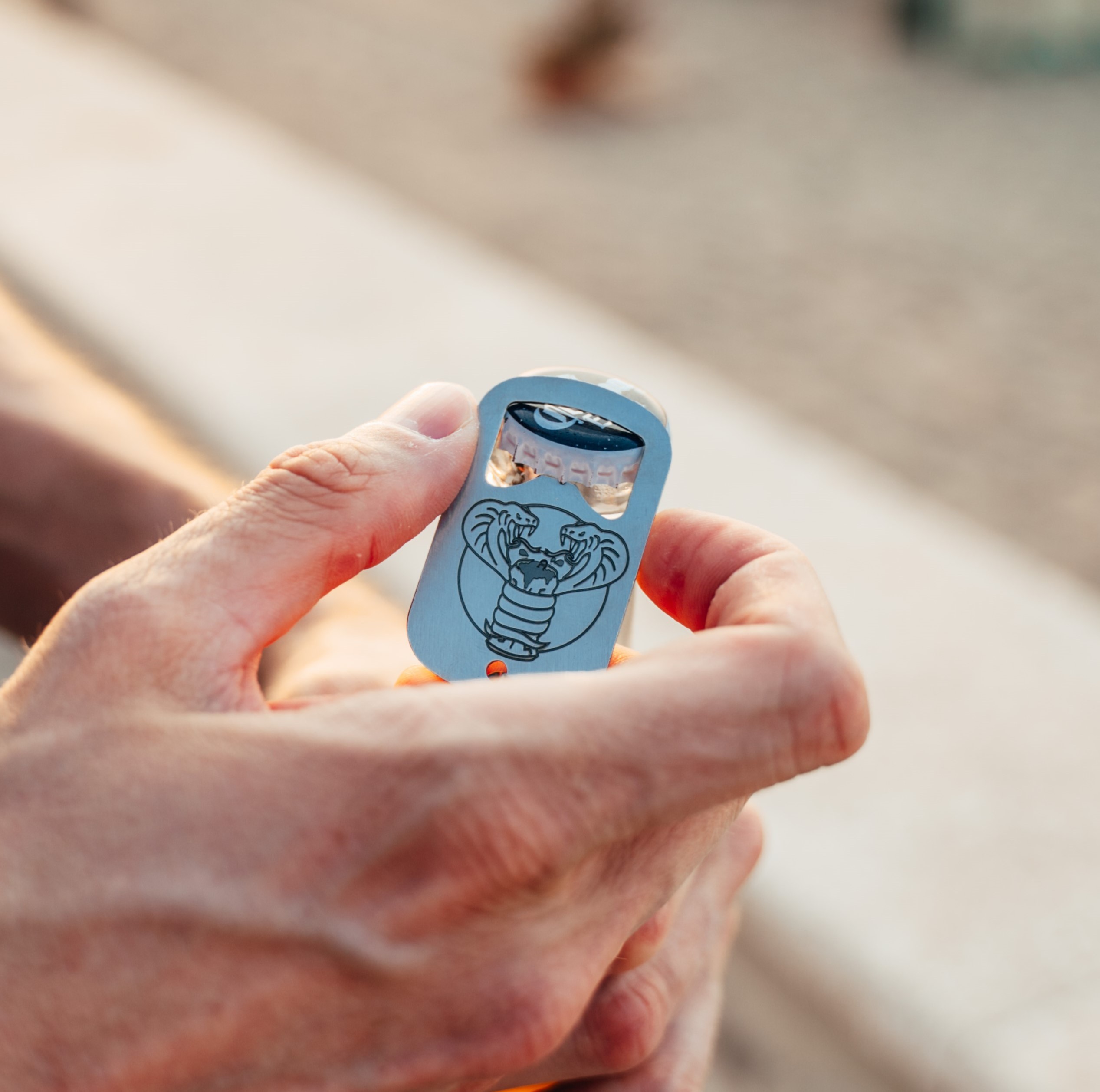 Flaschenöffner, beidseitig graviert, mit einem Schlüsselring.